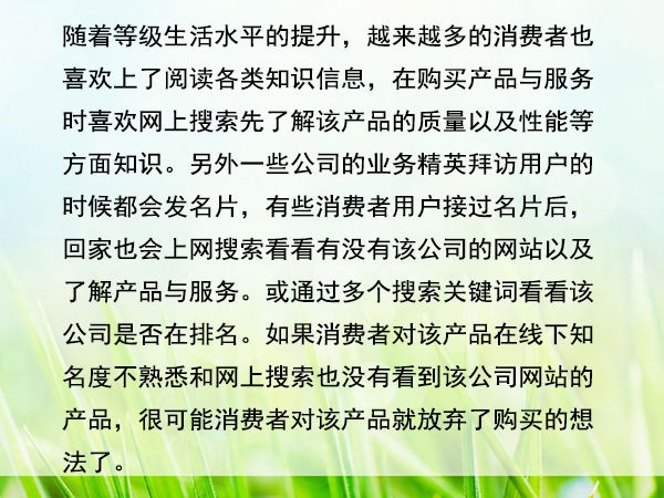 隨著等級生活水平的提升,越來越多的消費(fèi)者也喜歡上了閱讀各類知識信息,在購買產(chǎn)品與服務(wù)時喜歡網(wǎng)上搜索先了解該產(chǎn)品的質(zhì)量以及性能等方面知識。另外一些公司的業(yè)務(wù)精英拜訪用戶的時候都會發(fā)名片,有些消費(fèi)者用戶接過名片后,回家也會上網(wǎng)搜索看看有沒有該公司的網(wǎng)站以及了解產(chǎn)品與服務(wù)?;蛲ㄟ^多個搜索關(guān)鍵詞看看該公司是否在排名。如果消費(fèi)者對該產(chǎn)品在線下知名度不熟悉和網(wǎng)上搜索也沒有看到該公司網(wǎng)站的產(chǎn)品,很可能消費(fèi)者對該產(chǎn)品就放棄了購買的想法了。