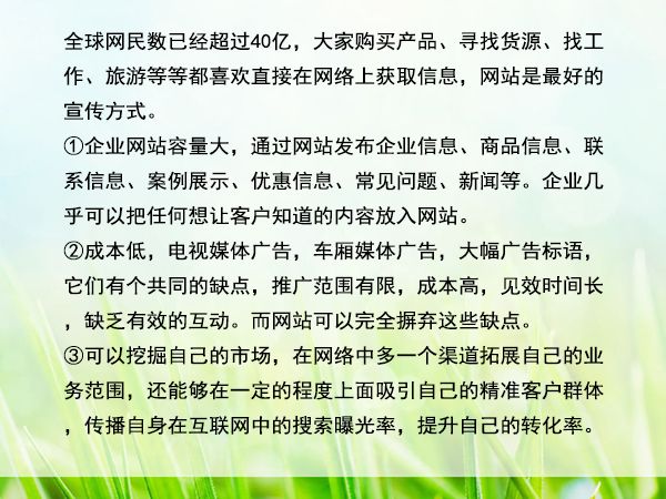 全球網(wǎng)民數(shù)已經(jīng)超過40億,大家購買產(chǎn)品、尋找貨源、找工作、旅游等等都喜歡直接在網(wǎng)絡上獲取信息,網(wǎng)站是最好的宣傳方式。