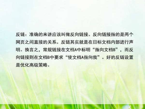 反鏈:準確的來講應該叫做反向鏈接。反向鏈接指的是兩個網(wǎng)頁之間直接的關系。反鏈其實就是在目標文檔內(nèi)部進行聲明。換言之,常規(guī)鏈接在文檔A中標明“指向文檔B”,而反向鏈接則在文檔B中要求“使文檔A指向我”。好的反鏈設置是優(yōu)化高級策略。