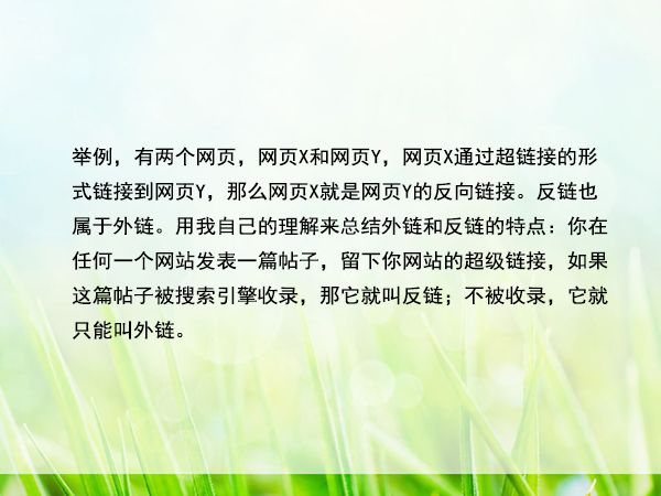 舉例,有兩個網(wǎng)頁,網(wǎng)頁X和網(wǎng)頁Y,網(wǎng)頁X通過超鏈接的形式鏈接到網(wǎng)頁Y,那么網(wǎng)頁X就是網(wǎng)頁Y的反向鏈接。反鏈也屬于外鏈。用我自己的理解來總結外鏈和反鏈的特點:你在任何一個網(wǎng)站發(fā)表一篇帖子,留下你網(wǎng)站的超級鏈接,如果這篇帖子被搜索引擎收錄,那它就叫反鏈;不被收錄,它就只能叫外鏈。