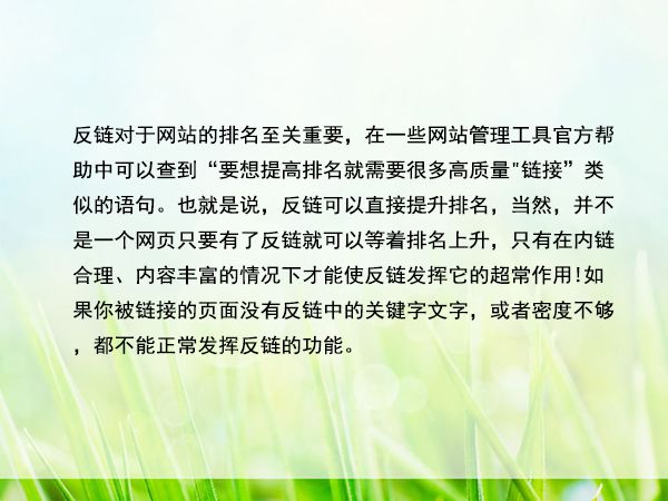 反鏈對于網(wǎng)站的排名至關重要,在一些網(wǎng)站管理工具官方幫助中可以查到“要想提高排名就需要很多高質(zhì)量"鏈接”類似的語句。也就是說,反鏈可以直接提升排名,當然,并不是一個網(wǎng)頁只要有了反鏈就可以等著排名上升,只有在內(nèi)鏈合理、內(nèi)容豐富的情況下才能使反鏈發(fā)揮它的超常作用!如果你被鏈接的頁面沒有反鏈中的關鍵字文字,或者密度不夠,都不能正常發(fā)揮反鏈的功能。