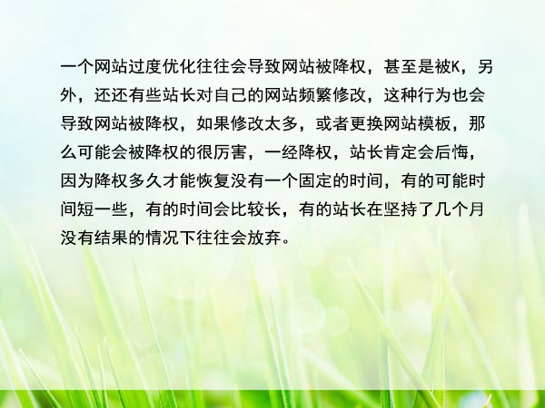 一個網(wǎng)站過度優(yōu)化往往會導(dǎo)致網(wǎng)站被降權(quán),甚至是被K,另外,還還有些站長對自己的網(wǎng)站頻繁修改,這種行為也會導(dǎo)致網(wǎng)站被降權(quán),如果修改太多,或者更換網(wǎng)站模板,那么可能會被降權(quán)的很厲害,一經(jīng)降權(quán),站長肯定會后悔,因?yàn)榻禉?quán)多久才能恢復(fù)沒有一個固定的時間,有的可能時間短一些,有的時間會比較長,有的站長在堅(jiān)持了幾個月沒有結(jié)果的情況下往往會放棄。