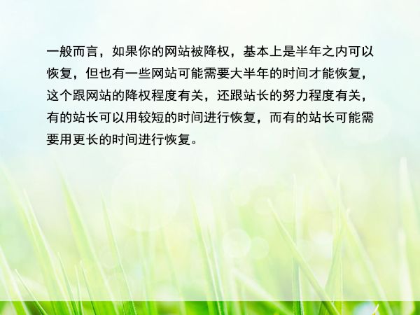 一般而言,如果你的網(wǎng)站被降權(quán),基本上是半年之內(nèi)可以恢復(fù),但也有一些網(wǎng)站可能需要大半年的時間才能恢復(fù),這個跟網(wǎng)站的降權(quán)程度有關(guān),還跟站長的努力程度有關(guān),有的站長可以用較短的時間進(jìn)行恢復(fù),而有的站長可能需要用更長的時間進(jìn)行恢復(fù)。