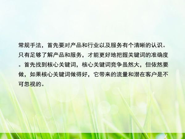 常規(guī)手法,首先要對產(chǎn)品和行業(yè)以及服務有個清晰的認識。只有足夠了解產(chǎn)品和服務,才能更好地把握關鍵詞的準確度。首先找到核心關鍵詞,核心關鍵詞競爭雖然大,但依然要做,如果核心關鍵詞做得好,它帶來的流量和潛在客戶是不可忽視的。