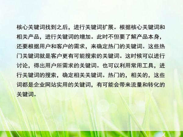 核心關鍵詞找到之后,進行關鍵詞擴展。根據(jù)核心關鍵詞和相關產(chǎn)品,進行關鍵詞的增加。此時不但要了解產(chǎn)品本身,還要根據(jù)用戶和客戶的需求,來確定熱門的關鍵詞。這些熱門關鍵詞就是客戶更有可能搜索的關鍵詞。這時候可以進行討論,得出用戶所需求的關鍵詞。也可以利用常用工具,進行關鍵詞的搜索,確定相關關鍵詞。熱門的,相關的,這些詞都是企業(yè)網(wǎng)站實用的關鍵詞,有可能會帶來流量和轉(zhuǎn)化的關鍵詞。