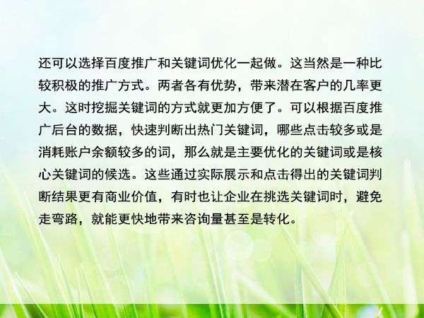 還可以選擇百度推廣和關鍵詞優(yōu)化一起做。這當然是一種比較積極的推廣方式。兩者各有優(yōu)勢,帶來潛在客戶的幾率更大。這時挖掘關鍵詞的方式就更加方便了。可以根據(jù)百度推廣后臺的數(shù)據(jù),快速判斷出熱門關鍵詞,哪些點擊較多或是消耗賬戶余額較多的詞,那么就是主要優(yōu)化的關鍵詞或是核心關鍵詞的候選。這些通過實際展示和點擊得出的關鍵詞判斷結(jié)果更有商業(yè)價值,有時也讓企業(yè)在挑選關鍵詞時,避免走彎路,就能更快地帶來咨詢量甚至是轉(zhuǎn)化。