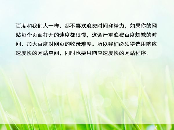 百度和我們?nèi)艘粯?,都不喜歡浪費(fèi)時(shí)間和精力,如果你的網(wǎng)站每個(gè)頁面打開的速度都很慢,這會(huì)嚴(yán)重浪費(fèi)百度蜘蛛的時(shí)間,加大百度對(duì)網(wǎng)頁的收錄難度。所以我們必須得選用響應(yīng)速度快的網(wǎng)站空間,同時(shí)也要用響應(yīng)速度快的網(wǎng)站程序。
