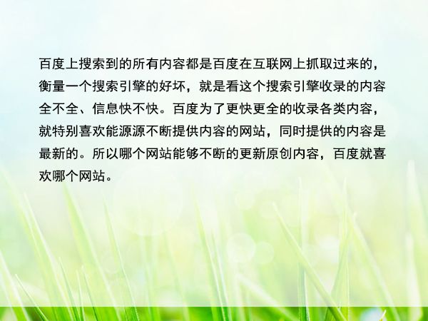 百度上搜索到的所有內(nèi)容都是百度在互聯(lián)網(wǎng)上抓取過來的,衡量一個(gè)搜索引擎的好壞,就是看這個(gè)搜索引擎收錄的內(nèi)容全不全、信息快不快。百度為了更快更全的收錄各類內(nèi)容,就特別喜歡能源源不斷提供內(nèi)容的網(wǎng)站,同時(shí)提供的內(nèi)容是最新的。所以哪個(gè)網(wǎng)站能夠不斷的更新原創(chuàng)內(nèi)容,百度就喜歡哪個(gè)網(wǎng)站。