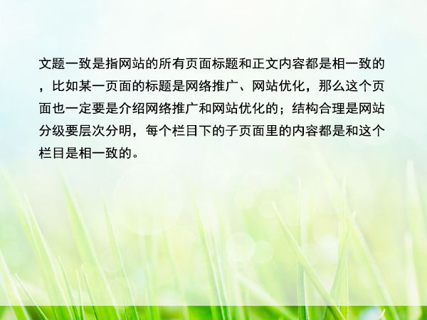 文題一致是指網(wǎng)站的所有頁面標(biāo)題和正文內(nèi)容都是相一致的,比如某一頁面的標(biāo)題是網(wǎng)絡(luò)推廣、網(wǎng)站優(yōu)化,那么這個(gè)頁面也一定要是介紹網(wǎng)絡(luò)推廣和網(wǎng)站優(yōu)化的;結(jié)構(gòu)合理是網(wǎng)站分級(jí)要層次分明,每個(gè)欄目下的子頁面里的內(nèi)容都是和這個(gè)欄目是相一致的。