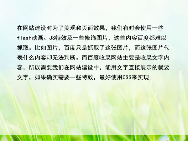 在網(wǎng)站建設(shè)時(shí)為了美觀和頁面效果,我們有時(shí)會(huì)使用一些flash動(dòng)畫、JS特效及一些修飾圖片,這些內(nèi)容百度都難以抓取。比如圖片,百度只是抓取了這張圖片,而這張圖片代表什么內(nèi)容卻無法判斷。而百度收錄網(wǎng)站主要是收錄文字內(nèi)容,所以需要我們?cè)诰W(wǎng)站建設(shè)中,能用文字直接展示的就要文字,如果確實(shí)需要一些特效,最好使用CSS來實(shí)現(xiàn)。