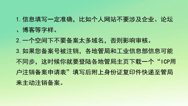 2.一個空間下不要備案太多域名,否則影響審核。