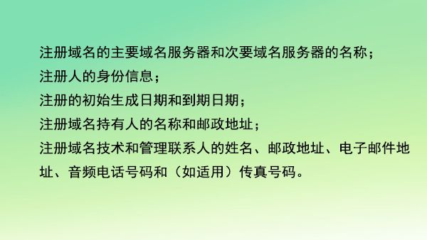 whois就是一個(gè)用來查詢域名是否已經(jīng)被注冊(cè),以及注冊(cè)域名的詳細(xì)信息的數(shù)據(jù)庫(kù),是當(dāng)前域名系統(tǒng)中不可或缺的一項(xiàng)信息服務(wù)。Whois數(shù)據(jù)是指注冊(cè)人向注冊(cè)商提供的信息,這些信息包括以下數(shù)據(jù)元素: