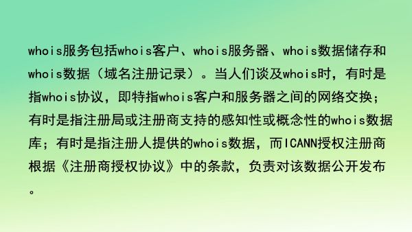 whois服務(wù)包括whois客戶、whois服務(wù)器、whois數(shù)據(jù)儲(chǔ)存和whois數(shù)據(jù)(域名注冊(cè)記錄)。當(dāng)人們談及whois時(shí),有時(shí)是指whois協(xié)議,即特指whois客戶和服務(wù)器之間的網(wǎng)絡(luò)交換;有時(shí)是指注冊(cè)局或注冊(cè)商支持的感知性或概念性的whois數(shù)據(jù)庫(kù);有時(shí)是指注冊(cè)人提供的whois數(shù)據(jù),而ICANN授權(quán)注冊(cè)商根據(jù)《注冊(cè)商授權(quán)協(xié)議》中的條款,負(fù)責(zé)對(duì)該數(shù)據(jù)公開發(fā)布。