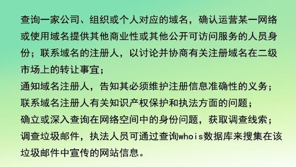 查詢一家公司、組織或個(gè)人對(duì)應(yīng)的域名,確認(rèn)運(yùn)營(yíng)某一網(wǎng)絡(luò)或使用域名提供其他商業(yè)性或其他公開可訪問服務(wù)的人員身份;