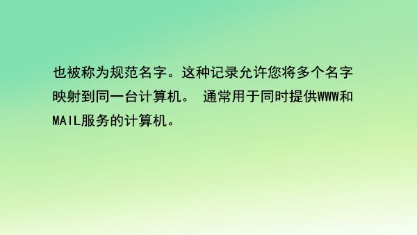 也被稱為規(guī)范名字。這種記錄允許您將多個(gè)名字映射到同一臺(tái)計(jì)算機(jī)。 通常用于同時(shí)提供WWW和MAIL服務(wù)的計(jì)算機(jī)。例如,有一臺(tái)計(jì)算機(jī)名為“host.mydomain.com”(A記錄)。 它同時(shí)提供WWW和MAIL服務(wù),為了便于用戶訪問服務(wù)??梢詾樵撚?jì)算機(jī)設(shè)置兩個(gè)別名(CNAME):WWW和MAIL。 這兩個(gè)別名的全稱就是“www.mydomain.com”和“mail.mydomain.com”。實(shí)際上他們都指向“host.mydomain.com”。