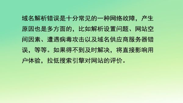 域名解析錯誤是十分常見的一種網(wǎng)絡(luò)故障,產(chǎn)生原因也是多方面的,比如解析設(shè)置問題、網(wǎng)站空間因素、遭遇病毒攻擊以及域名供應(yīng)商服務(wù)器錯誤,等等。如果得不到及時解決,將直接影響用戶體驗,拉低搜索引擎對網(wǎng)站的評價。解決這一問題可以遵循以下步驟逐一排查: