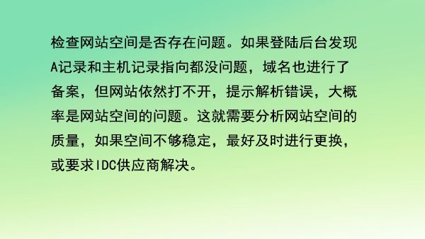 其次,檢查網(wǎng)站空間是否存在問題。如果登陸后臺發(fā)現(xiàn)A記錄和主機記錄指向都沒問題,域名也進行了備案,但網(wǎng)站依然打不開,提示解析錯誤,大概率是網(wǎng)站空間的問題。這就需要分析網(wǎng)站空間的質(zhì)量,如果空間不夠穩(wěn)定,最好及時進行更換,或要求IDC供應(yīng)商解決。