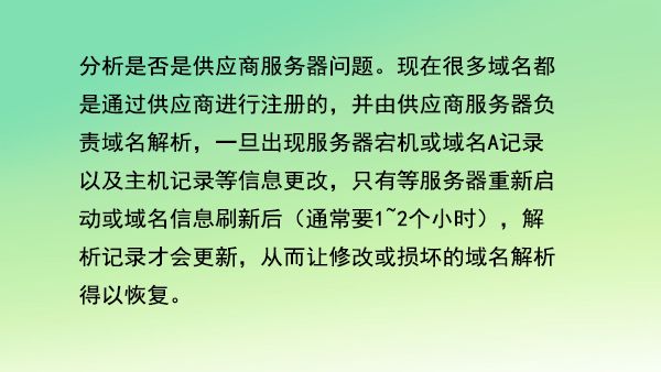 最后,分析是否是供應(yīng)商服務(wù)器問題?,F(xiàn)在很多域名都是通過供應(yīng)商進行注冊的,并由供應(yīng)商服務(wù)器負責(zé)域名解析,一旦出現(xiàn)服務(wù)器宕機或域名A記錄以及主機記錄等信息更改,只有等服務(wù)器重新啟動或域名信息刷新后(通常要1~2個小時),解析記錄才會更新,從而讓修改或損壞的域名解析得以恢復(fù)。